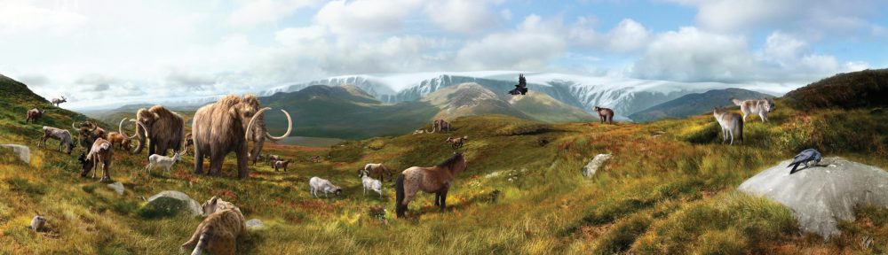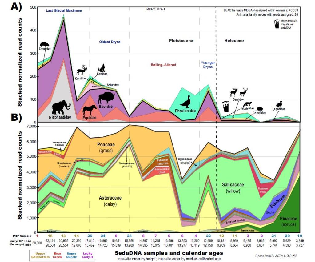 Un certain nombre d’animaux ont ainsi pu être détectés dans les échantillons analysés, notamment le bison (Bison priscus), le mammouth laineux (Mammuthus primigenus), le cheval (Equus sp.), et la perdrix blanche (Lagopus lagopus). Dans l’ensemble la diversité animale détectée indique un déclin graduel de la mégafaune à travers le temps, notablement des Eléphantidés qui est l’un des premiers groupes dont l’ADN décroît en abondance après -20000 ans jusqu’à leur disparition quasi-totale à la jonction Pléistocène-Holocène. A cette époque-là en revanche apparaissent de nouveaux taxons comme l’élan (Alces alces) et probablement le wapiti (Cervus sp.). Il est à noter que le cheval et le mammouth sont détectés (faiblement) jusqu’à -6000 ans, soit bien après leur dernière mention dans le registre paléontologique des mêmes localités.